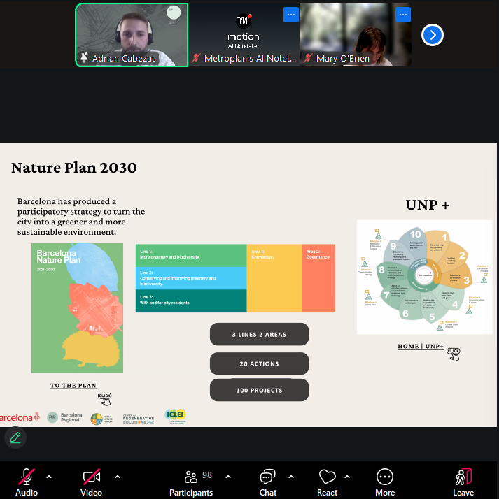 Adrián Cabezas (Barcelona Regional) provided a European perspective, highlighting Barcelona’s Nature Plan 2030 and its deliberate alignment of biodiversity, public health and social equity. The plan includes more than 100 projects and shifts the city toward ecological maintenance, banning herbicides and enhancing spontaneous vegetation. Cabezas emphasised that these measures are not cosmetic: