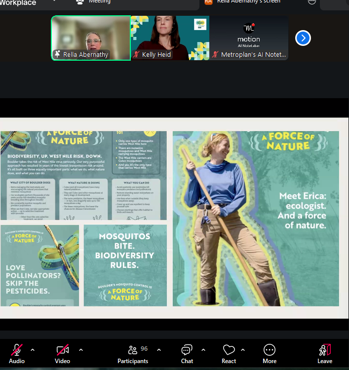 From Colorado, Rella Abernathy (City of Boulder) presented an ecosystem-based approach to reducing mosquito-borne disease risk. She highlighted the limitations of conventional adulticide spraying, noting its impacts on non-target species and ecosystem function. Boulder instead emphasises larval-stage control, habitat monitoring, and community education, recognising that most land is privately owned and requires public participation for biodiversity measures to be effective. Abernathy reinforced the broader message that healthy wetlands are essential for healthy communities.